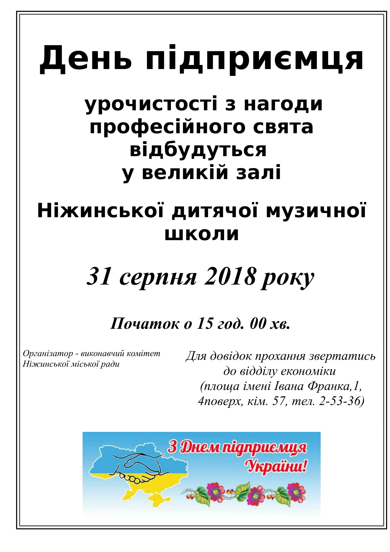 Запрошення на свято “День підприємця” (31.08 на 15.00 Музична школа) Posted on 29.08.2018 by адмін Виконавчий комітет запрошує трудові колективи на урочистості з нагоди свята “День підприємця” !!!!