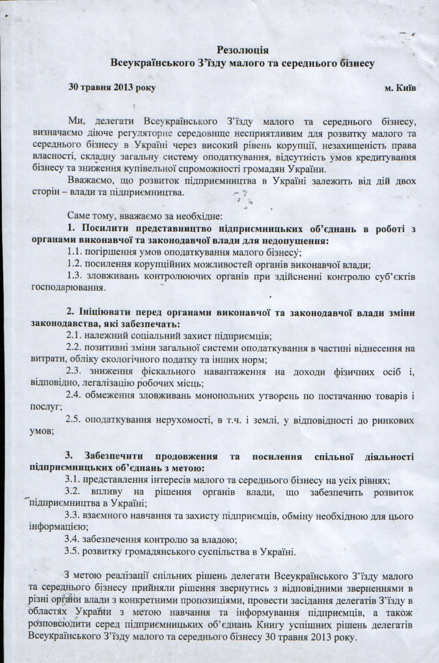 Резолюція Всеукраїнського з`їзду малого та середнього бізнесу